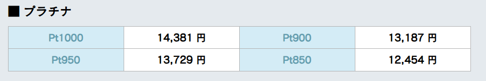 Pt1000・Pt950・Pt900など、種類別の買取相場を公式に公開。