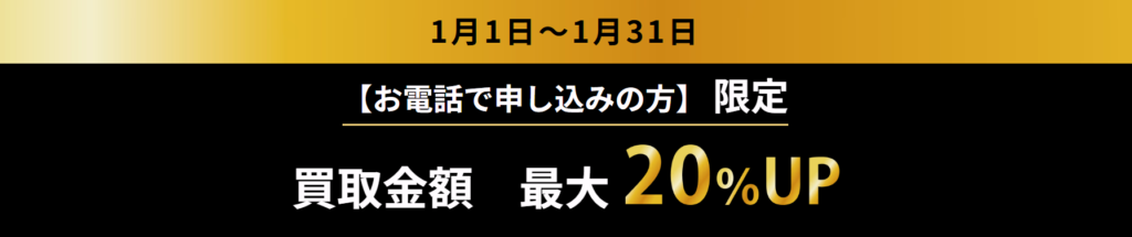 | キャンペーン | 総額100万円以上で 10万円プラスや、 買取額最大30%アップなど | LINE査定買取額3倍など | タクシー代 ・駐車場代キャッシュバックなど | 初回査定料20%アップなど | ブランドジュエリー査定額 10%アップなど | 抽選で買取額5倍 |