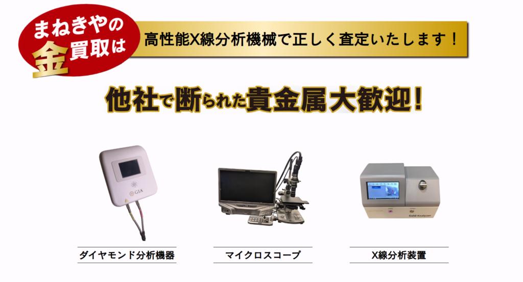 | 1位 まねきや | ![]() 高め! | ![]() 査定無料 | ![]() X線・分析機器を 本格導入 +専門アドバイザー | |